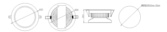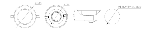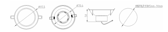 b.嵌頂式燈具安裝:在天花板上開(kāi)好安裝孔位,相應(yīng)的燈具開(kāi)孔尺寸為φ97.5mm(或 107.5),天花 板厚度為 1-20mm。將燈具上的彈簧按圖所示方向撐開(kāi)到可以塞入安裝孔,保持彈簧張開(kāi)狀態(tài),將燈具放入安裝孔,松開(kāi)彈簧,此時(shí)彈簧復(fù)位,將燈具固定在天花板上,即完成安裝。